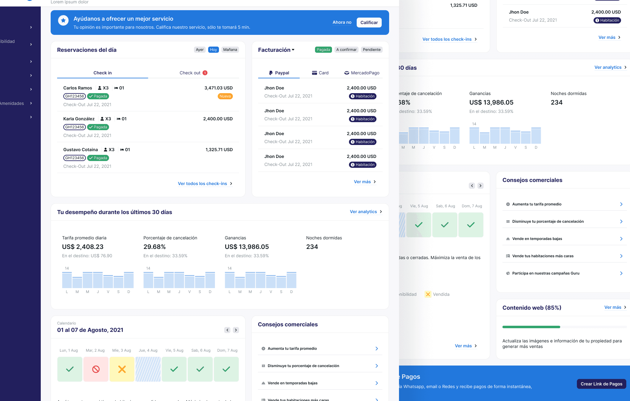 GuruHotel es una plataforma diseñada para impulsar la digitalización de hoteles, independientemente de su tamaño. Ofrece la posibilidad de migrar, crear o mejorar los sitios web de los hoteles, conectándolos con las operaciones fundamentales del sector. Facilita la conversión de visitantes en clientes, brinda herramientas para administrar habitaciones, ventas y promociones, y es fácil de gestionar por los propios usuarios. Además, simplifica los pagos transfronterizos, permitiendo que las compras se realicen desde cualquier lugar del mundo y que los hoteles reciban los pagos en pesos mexicanos.
